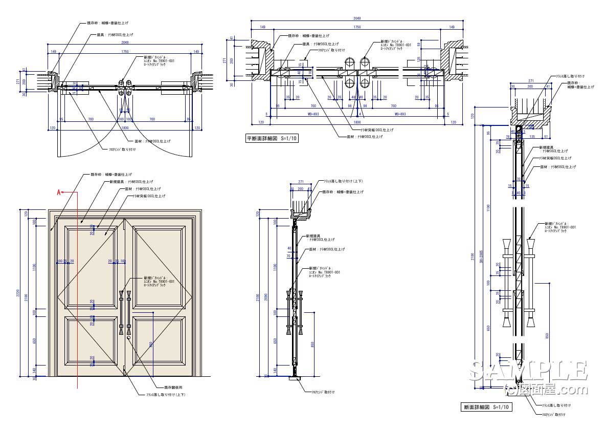 建具 面材を多用した両開きの木製建具に事例図面屋.com 店舗設計詳細図「虎の巻」。