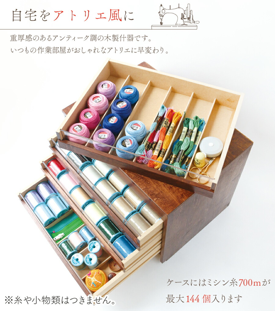 ミシン糸 +ボビン50個収納 オーク色糸たて裁縫箱 可愛いソーイング。