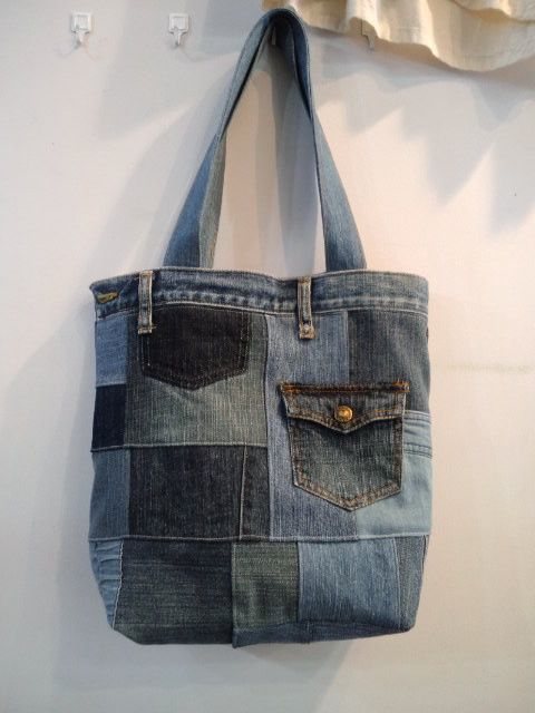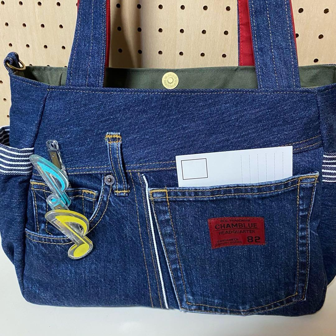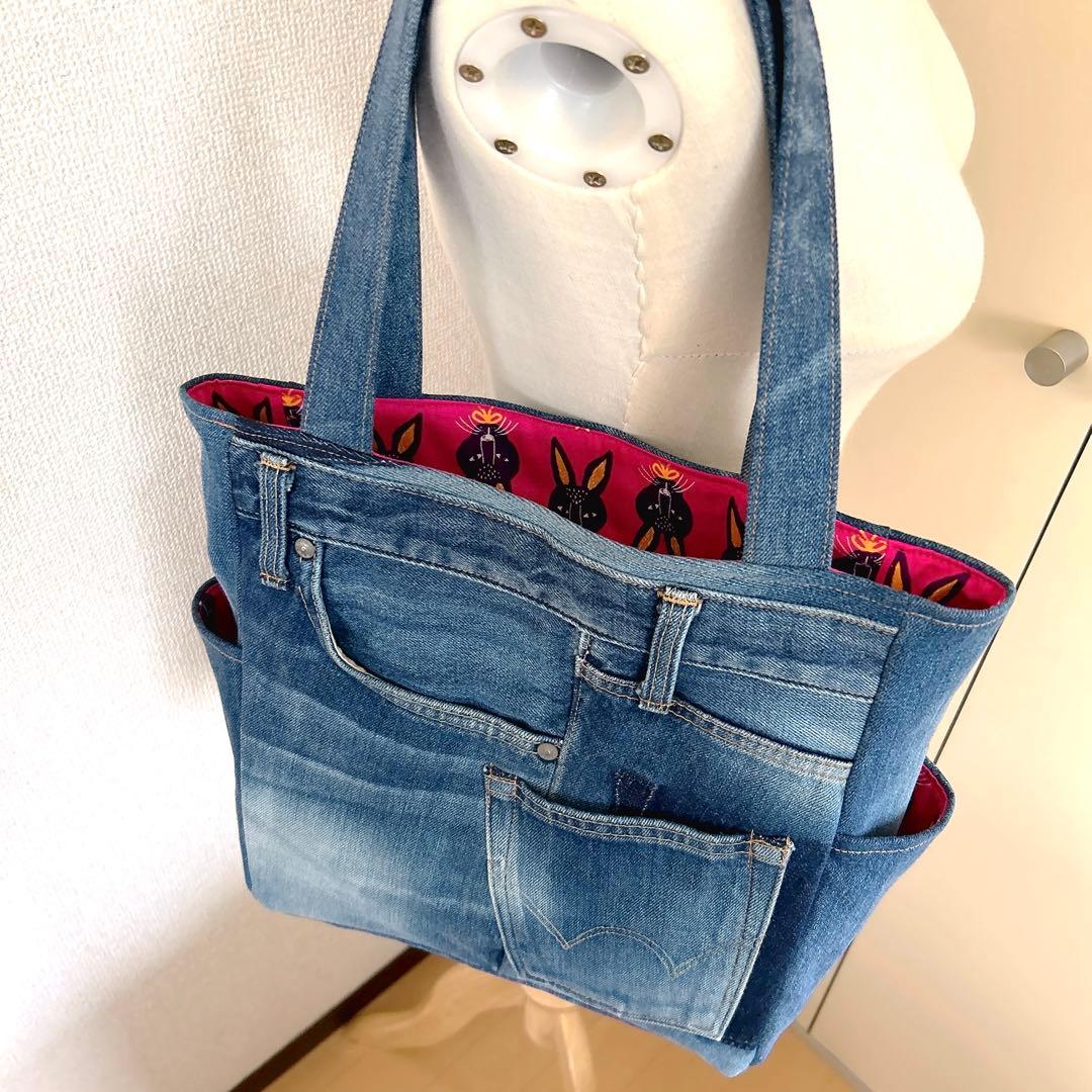 デニムリメイクバッグ S トートバッグハンドメイド トートバッグ作り方 ポケット付きトートバッグ作って。
