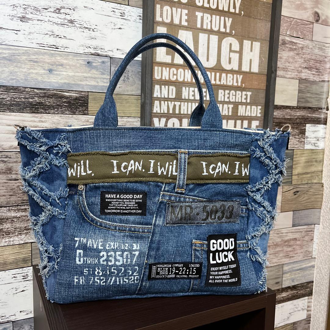 大容量バック デニムリメイクトートバッグ ショルダー ハンドメイド 楽天市場2個で3%off☆SALE カバン デニム ショルダートートバック リメイクバッグ 男女兼用 ハンドメイド トート かばん デコジーンズ ジーパン デニム生地 斜めかけバッグ トートバッグ。