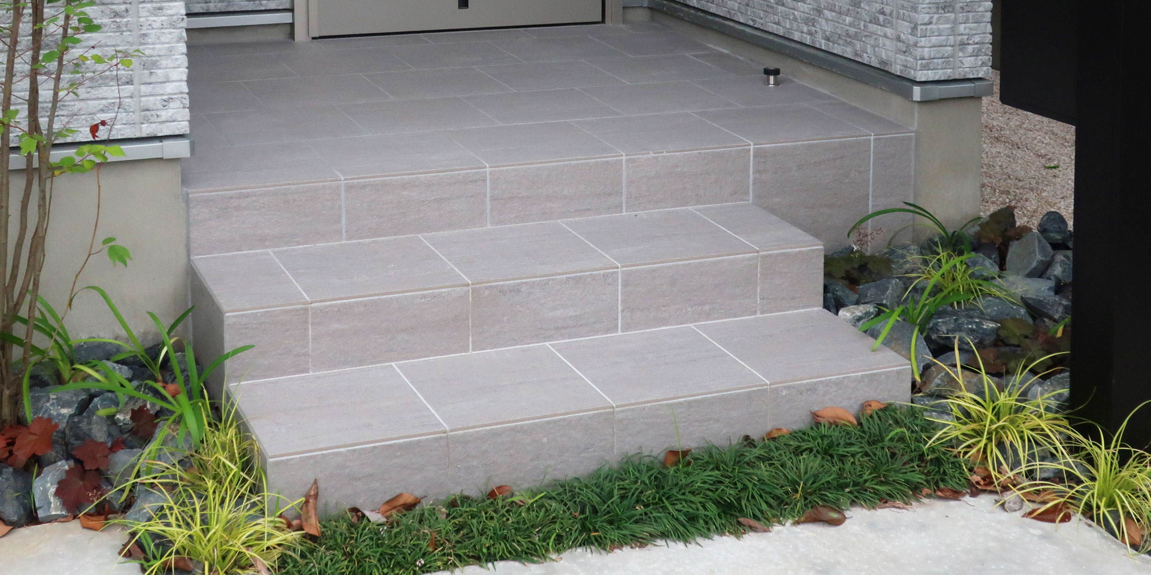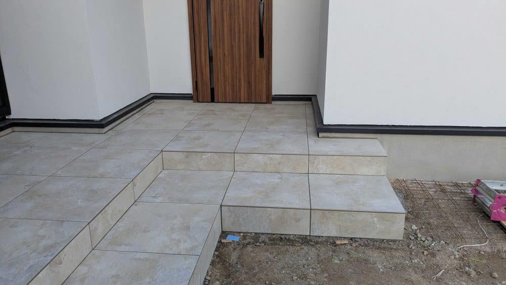 印西市の外構工事では玄関ポーチのタイル張りをやっています。外構エクステリアを柏市・流山市・印西市などでお悩みならガーデン:タイム。