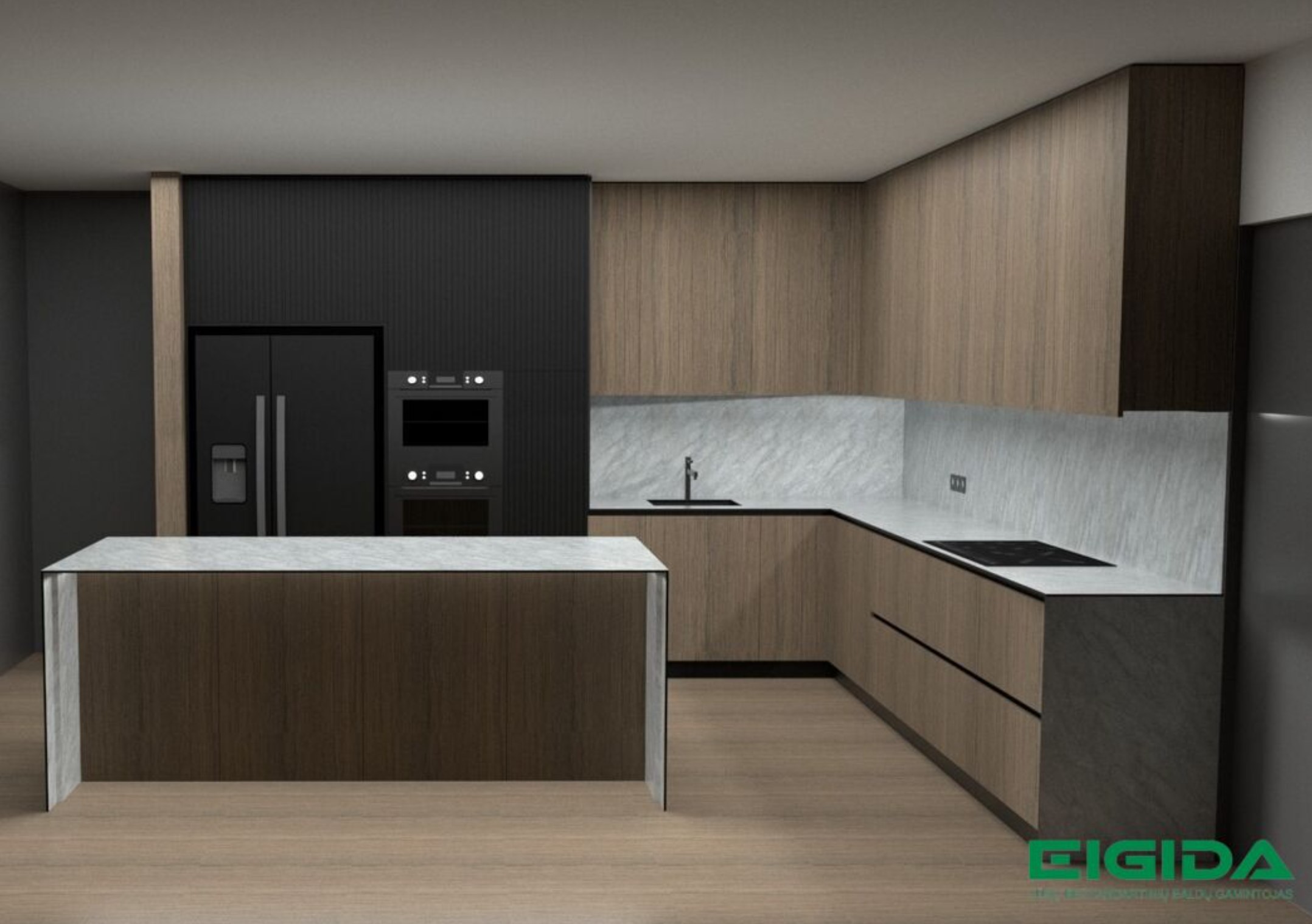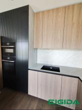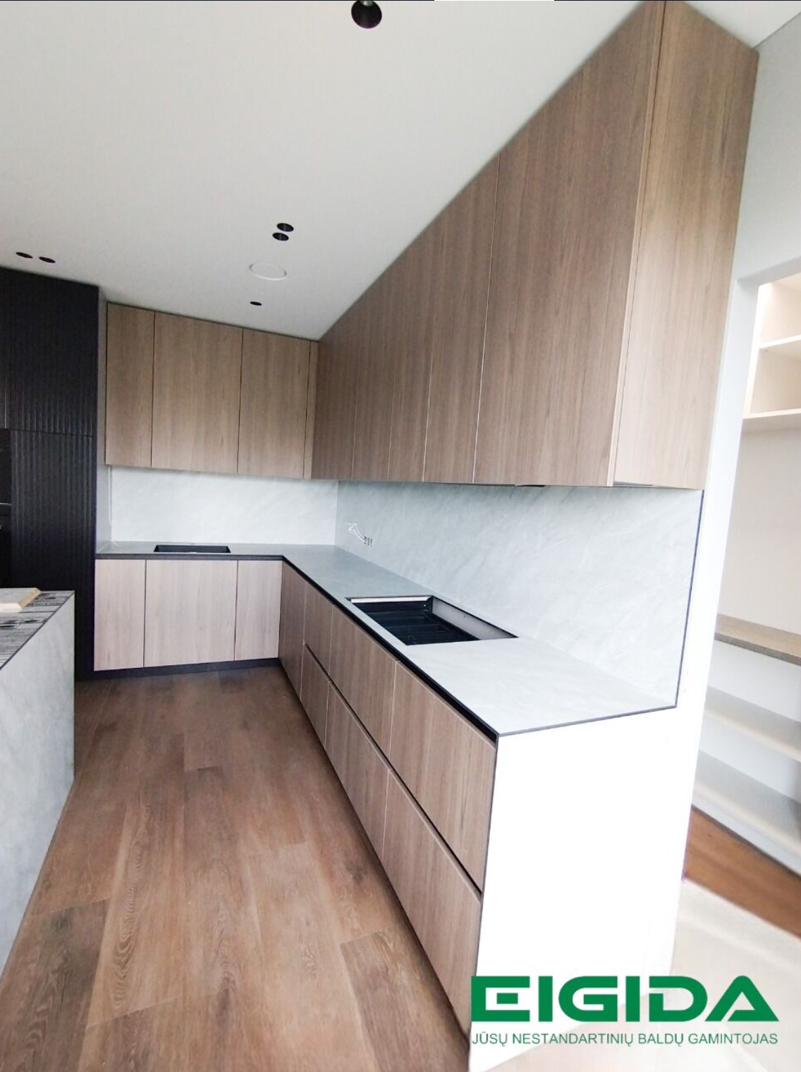 Modernūs Tikmedžio ir juodo fasado virtuvės balda