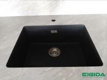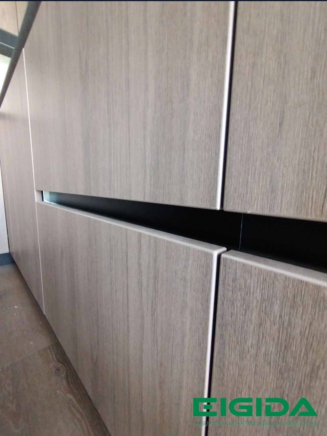 Fasadas – 18mm LMDF frezuotas grioveliais, dažytas matiniais RAL 9004 spalvos dažais. Matomi sujungimai suleisti 45 laipsnių kampu.