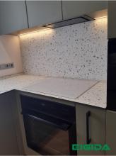 Stalviršis / Sienelė – Compact HPL 10 Skaldyti akmenėliai baltame fone su juodu užpildu.